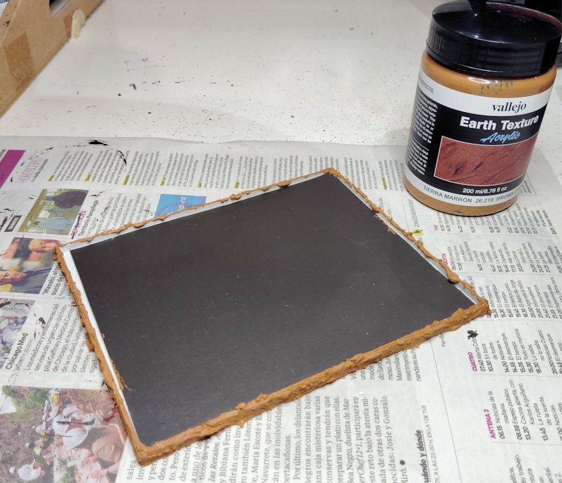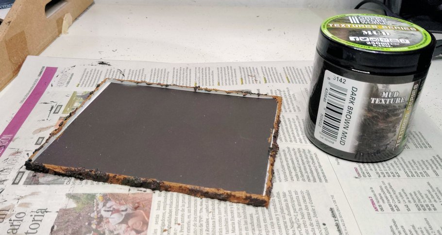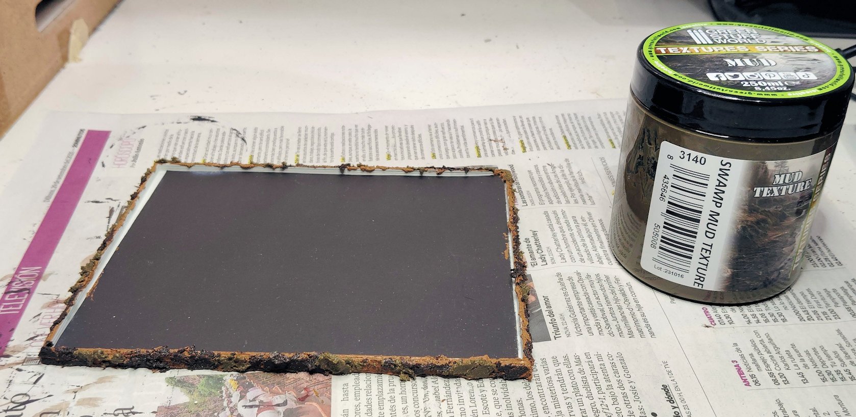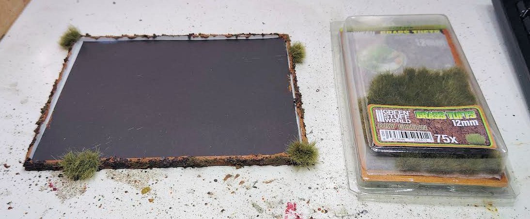 Este es un punto muy sencillo pero es la diferencia entre una bandeja de movimiento «simplemente práctica» a una bandeja «realmente bonita». Siempre decoro los bordes de la bandeja de movimiento con el mismo «tema» que las miniaturas (aunque simplificado). Es decir, el mismo esquema y las mismas pinturas que uso para las peanas de mis orcos lo uso para los bordes (aunque a la bandeja no le meto pigmentos por ejemplo). En este caso (pantano), primero va una capa de la genial e imprescindible pintura texturizada de Vallejo Tierra Marrón, seguido de dos pinturas texturizadas de Green Stuff World (Dark Brown Mud y Swamp Mud). Por último meto algunos hierbajos, que últimamente con los pielesverdes estoy usando los de (de nuevo) GSW, Dry Green (los de Army Painter eran mis favoritos hasta que he empezado a usar los de la marca alicantina)