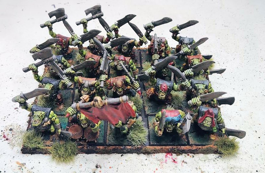 Y aquí tenéis el resultado. Sí que se nota que hay pigmentos en las peanas de los orcos y no en la bandeja de movimiento, pero el resto unifica las peanas. Y el hecho de tener todo el ejército con estas bandejas de movimiento da una sensación brutal y mejora la experiencia de juego.