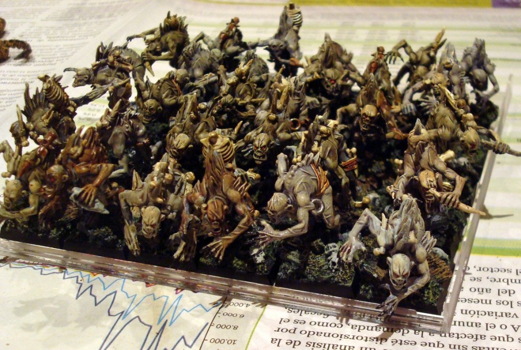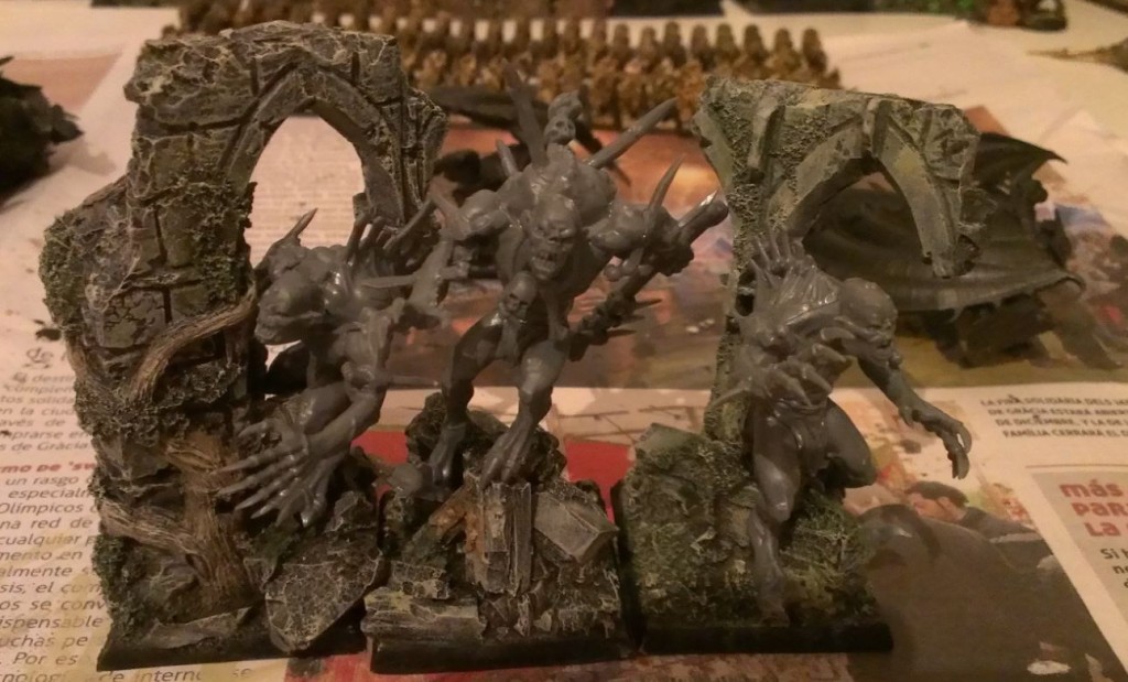 Aún no sé cuál de las dos unidades pintar. Tengo guardadas (y por pintar) más peanas escénicas, así que las que no haga ahora, las haré más tarde (no es, por tanto, «o hago esto o hago lo otro»). Sé que si elijo los Horrores los pintaré de «verde muerto» como los Necrófagos y si me quedo con los Vargheists serán de color carne (el gris no contrastaría con la piedra).
