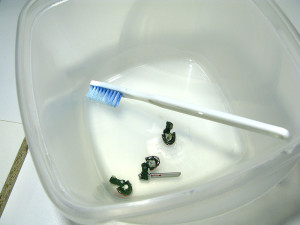 2. Frotamos con cuidado la miniatura con el cepillo de dientes. Es recomendable que preparemos un recipiente grande para poder trabajar dentro de el sin miedo a que el cepillo de dientes escupa pintura blanda a una zona donde pueda invocar un capón hacia tu persona.