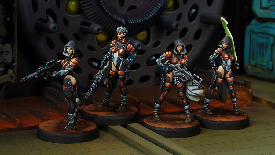 El trasfondo, como ya avanzábamos al principio del artículo, nos hace tener altas expectativas sobre las chicas. Una secta escindida del catolicismo por su rechazo a la IA Aleph, que recoge tradiciones de culto a la mujer de la antigua Grecia y se erige como defensora de la verdadera humanidad creyente (anti- Aleph), planta su monasterio en la nave que probablemente sea el mayor antro de depravación de la Esfera, la nave Bakunin, donde puede obtenerse cualquier cosa por sórdida o ilegal que sea. Le añadimos un toque de fanatismo flagelante con ciber-implantes de “clavos santificados” para hacer penitencia y demostrar compromiso, y tenemos una especie de “inquisidoras/cruzadas” que todos ansiamos meter en nuestras listas.