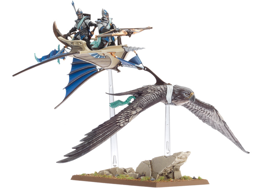 Si no os gustan estos bichejos voladores se puede optar por un Escolta Celeste, que permite montar un tremendo carro volador con lanzavirotes más un Yelmo del Mar que puede ser Portaestandarte de Batalla (es como se lo he montado a mi señora) con lo que tienes 250+ puntos más por 47€. Una tercera opción es dos Lanzavirotes (42€), o, mejor aún, un Lanzavirotes y un Carro de Leones (45€).