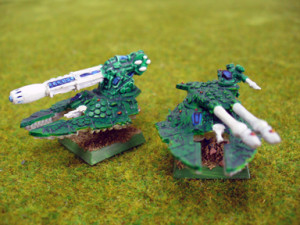 En primer lugar tenemos las Espadas de Vaul, formaciones compuestas por entre 5 y 6 Falcones, Firestorms y/o Prismas. Los Falcones son probablemente la mejor unidad antitanque del juego (2 x AT4+ y 1 x AP5+/AT5+ cada uno), y pueden combinarse con Prismas para esos objetivos con blindaje realmente grueso (AT2+, anulando blindaje reforzado), y con Firestorms (algo menos potentes, pero con armas antiaéreas). Una formación de Espadas de Vaul es capaz de hacer un daño tremendo a cualquier formación de tanques que el enemigo pueda desplegar. Sin embargo, deben estar muy bien protegidos, pues su Blindaje es sólo 5+.