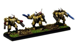 Los equipos Crisis son excelentes, y puedes incluir todos los que quieras sin limitación. Incluso puedes adquirir mejoras en forma de Armaduras Crisis adicionales (se puede duplicar el tamaño de la formación), Drones de Armas (combinan muy bien, porque mueven igual y son del mismo tipo de tropa) y un Shas’o por ejército (el Comandante en Jefe).