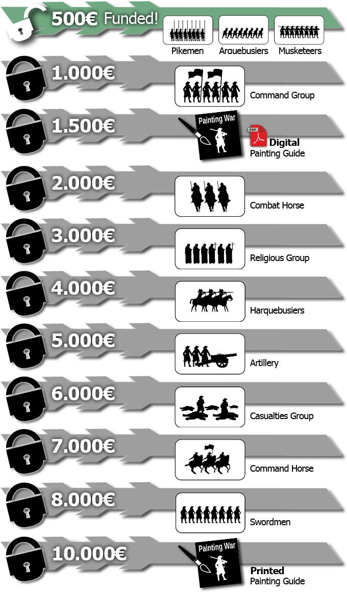 Bueno, yo no tengo nada contra las preventas ni quiero entrar en una discusión filosófica, pero para mí esto es lo que considero un crowfunding: una empresa pequeñita (no Mantic ni CMON) que busca financiación para sacar un proyecto a un precio normal de mercado (la caballería algo más cara) y en un plazo razonable de tiempo (6 meses). Sin necesidad de prometer tropecientos extras que al final pueden retrasar el plazo de entrega… De todas formas, aún no sé seguro si lo apoyaré, tengo el reglamento, su suplemento «Kingdoms» y varias cartas de ejército, pero para esta época casi me gusta más la escala de 15 mm. Aunque las miniaturas la verdad es que están chulas, y los piqueros me pueden servir como mercenarios de Warhammer y los espadachines para el juego de mesa de Alatriste…