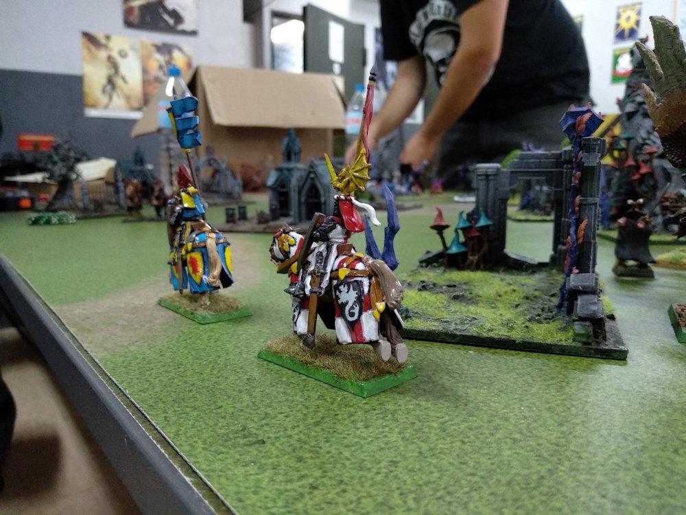 • Señor Bretoniano en Hipogrifo con Voto del Grial (inmune a psicología). Dado que iba a ser sólo personajes, podía atreverme a desafiar, así que tenía la Virtud de la Confianza aderezado con una Espada de Carcassonne (en resumen, yo siempre repetía para impactar y herir, y mi enemigo las armaduras). Finalizaba el «combo» el Manto de la Damisela Elena (inmune a envenenados y golpe letal).