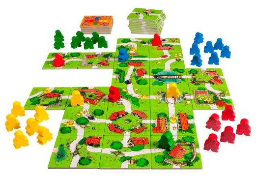 Ya hablamos de él hace dos años, pero hasta ahora no hemos podido probarlo a 4 en condiciones. De los tres, Carcassonne Junior (4+) es el más apropiado para niños pequeños. De hecho a la pequeña es el que más le gusta, mientras que el mayor ya sabe cómo jugar bastante bien (aunque le falta el «puteo», piensa a más de un turno vista). En cuanto a parecido. es de los tres el que más se aleja del principal, por lo que «saltar» al juego principal es casi un juego nuevo (el mayor ha catado ya la versión «senior»).