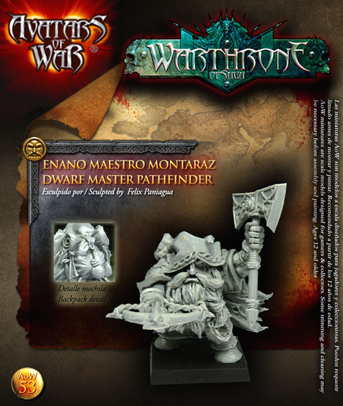 Para Enanos, un Maestro Montaraz esculpido por Félix Paniagua. El Maestro Montaraz está diseñado para ser usado como campeón de un regimiento de Enanos Montaraces. Más detalles sobre esta miniatura aquí.